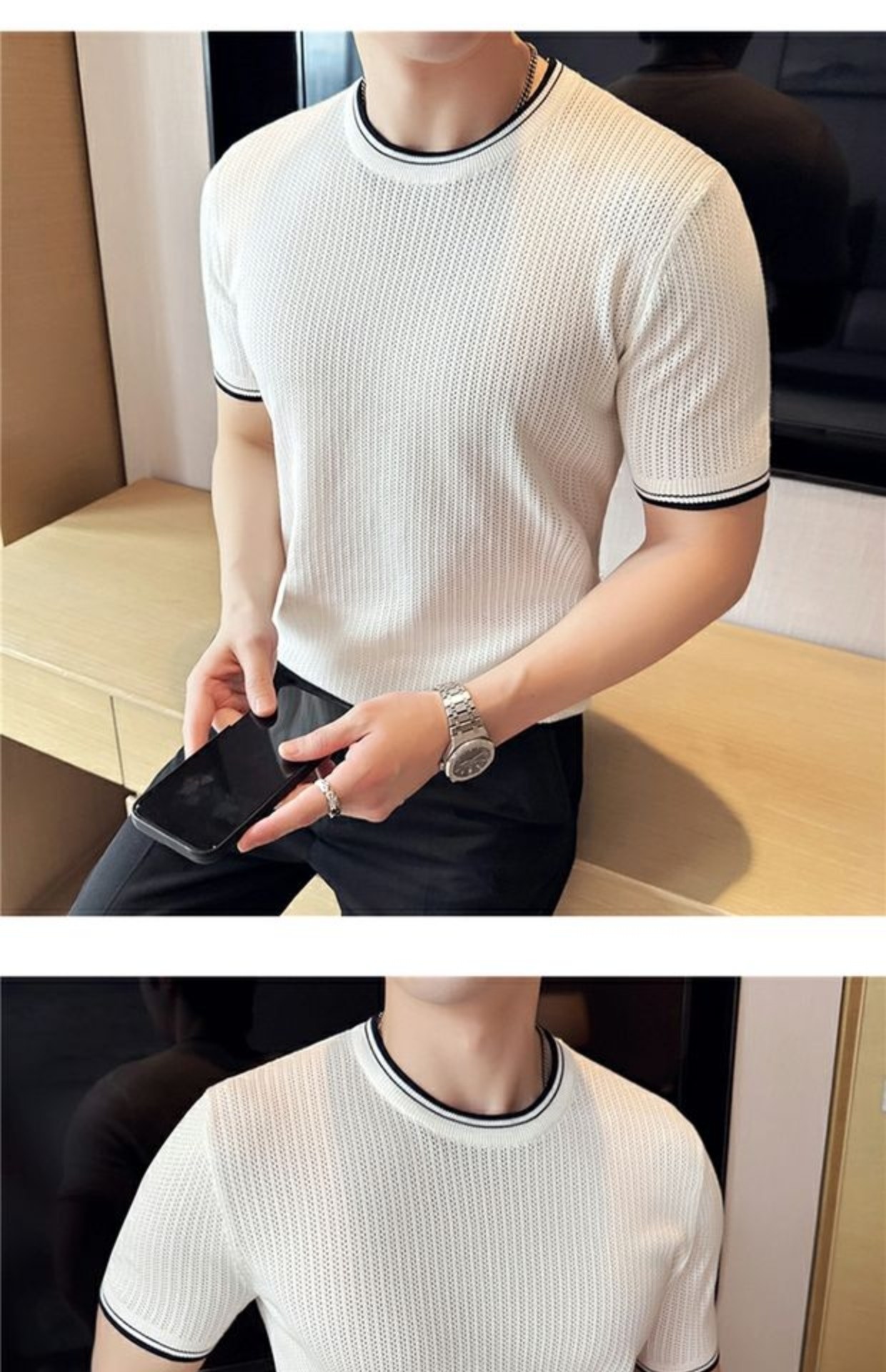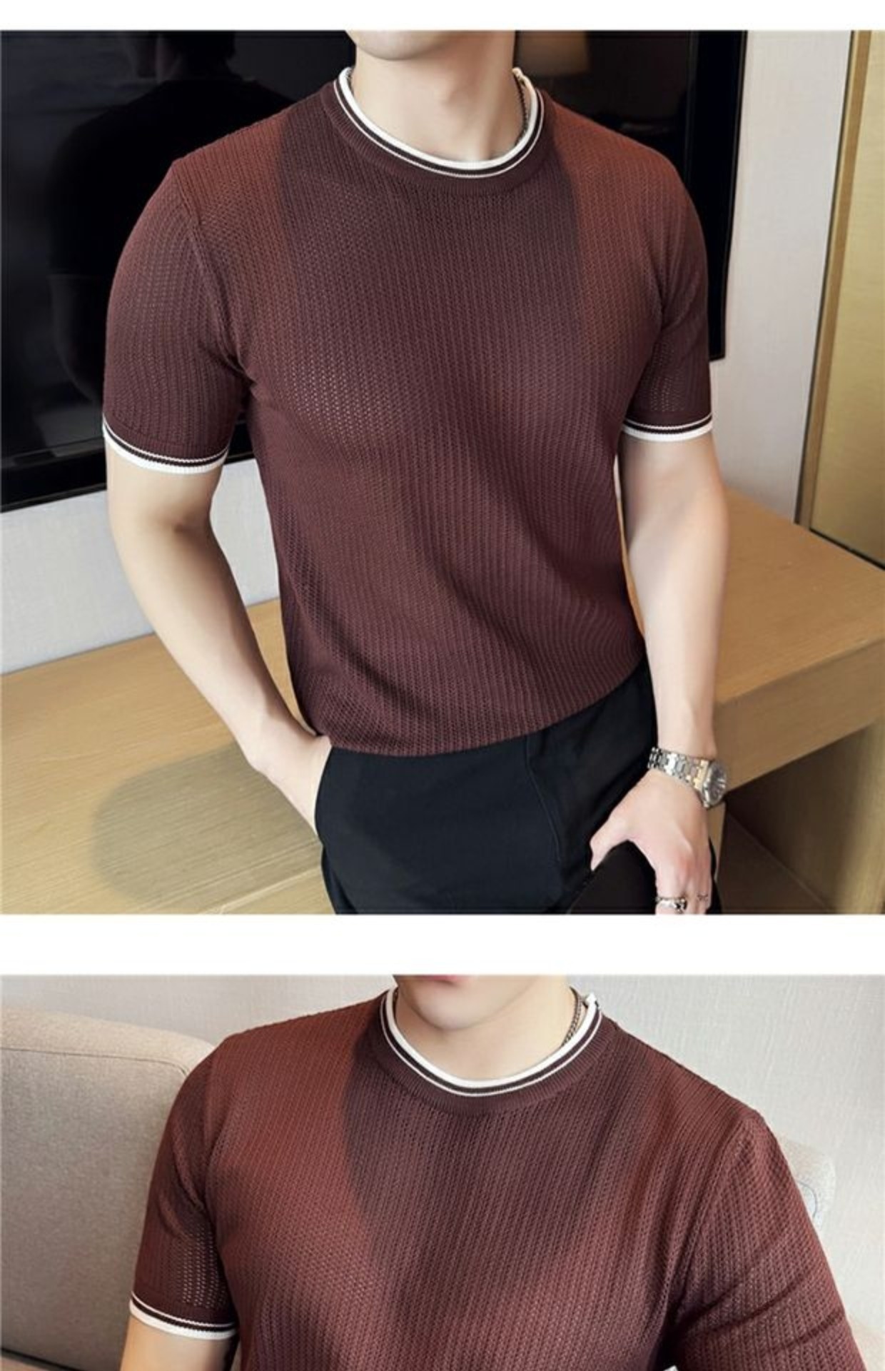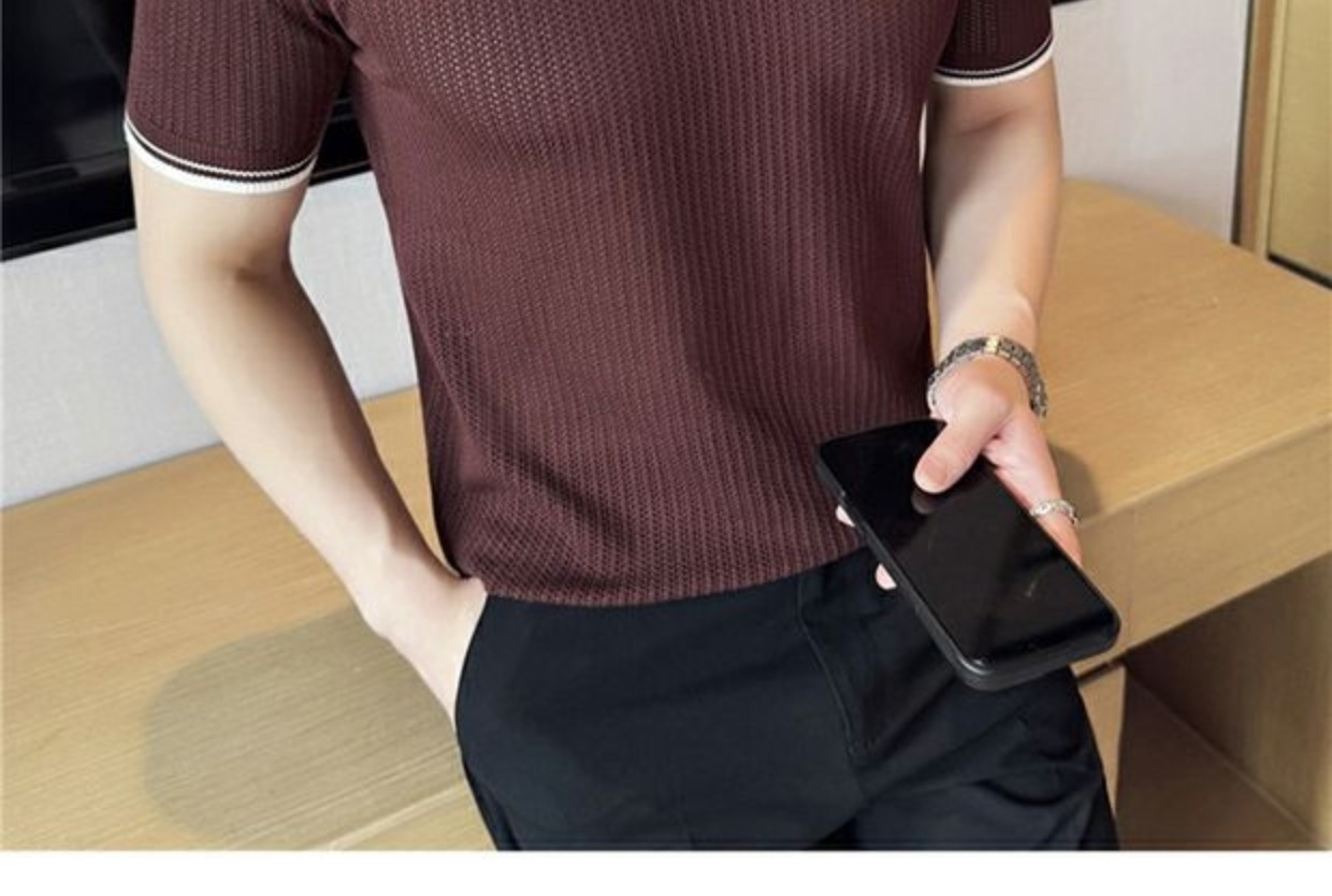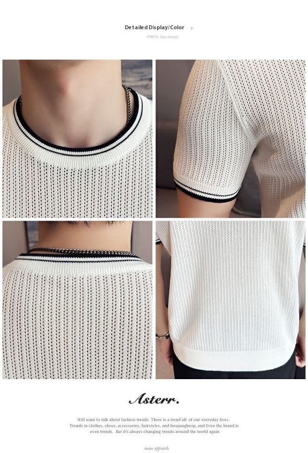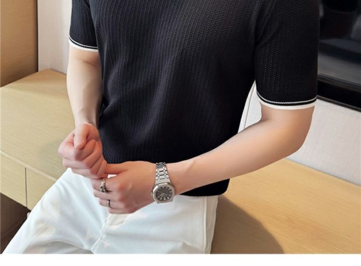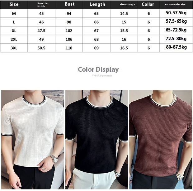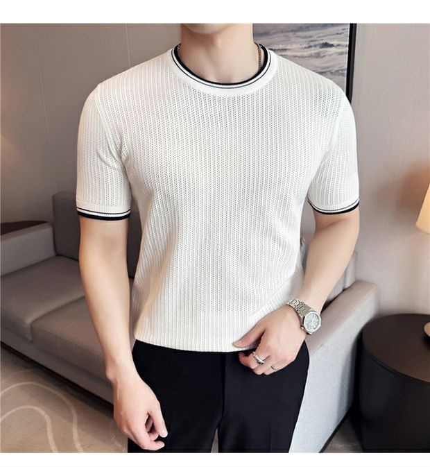 Men's Round Neck Contrast Color Stretch Knitted T-shirt
