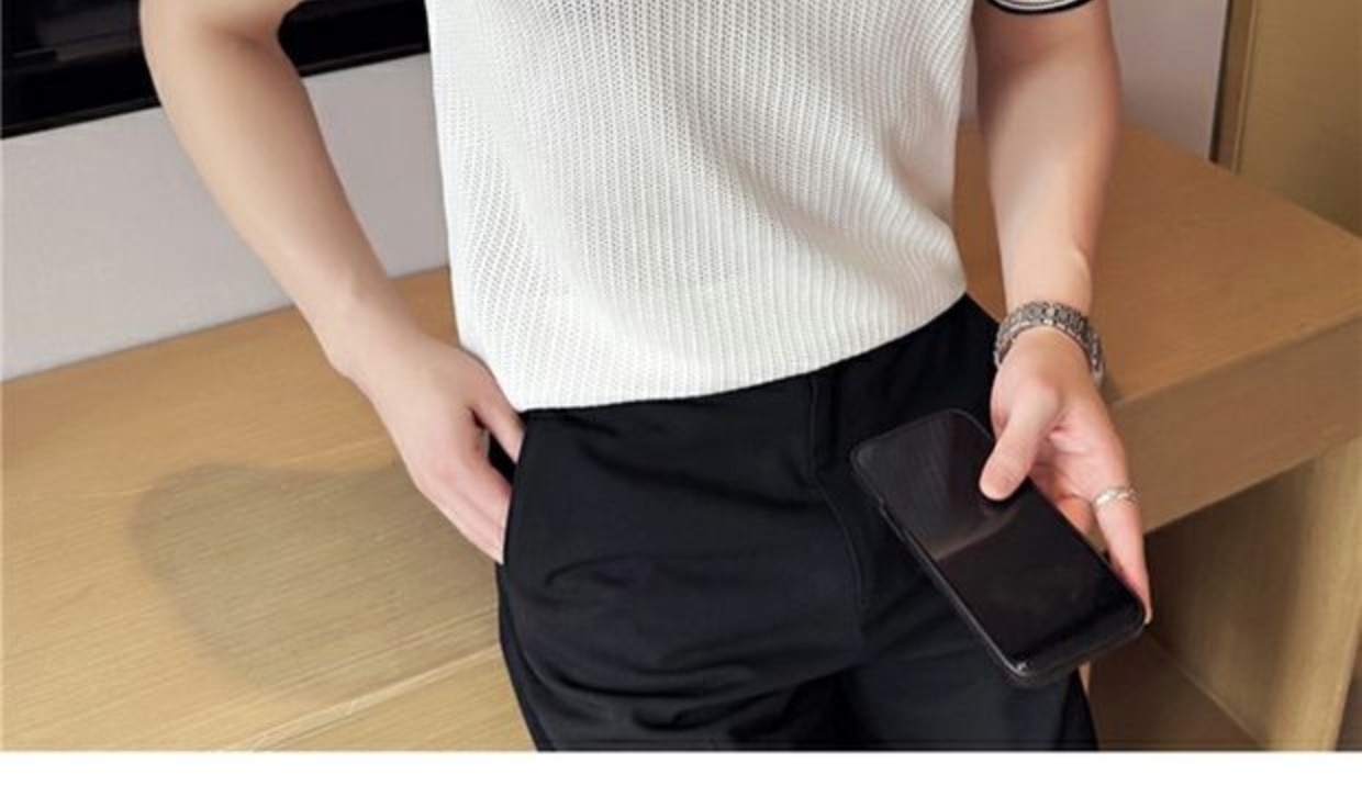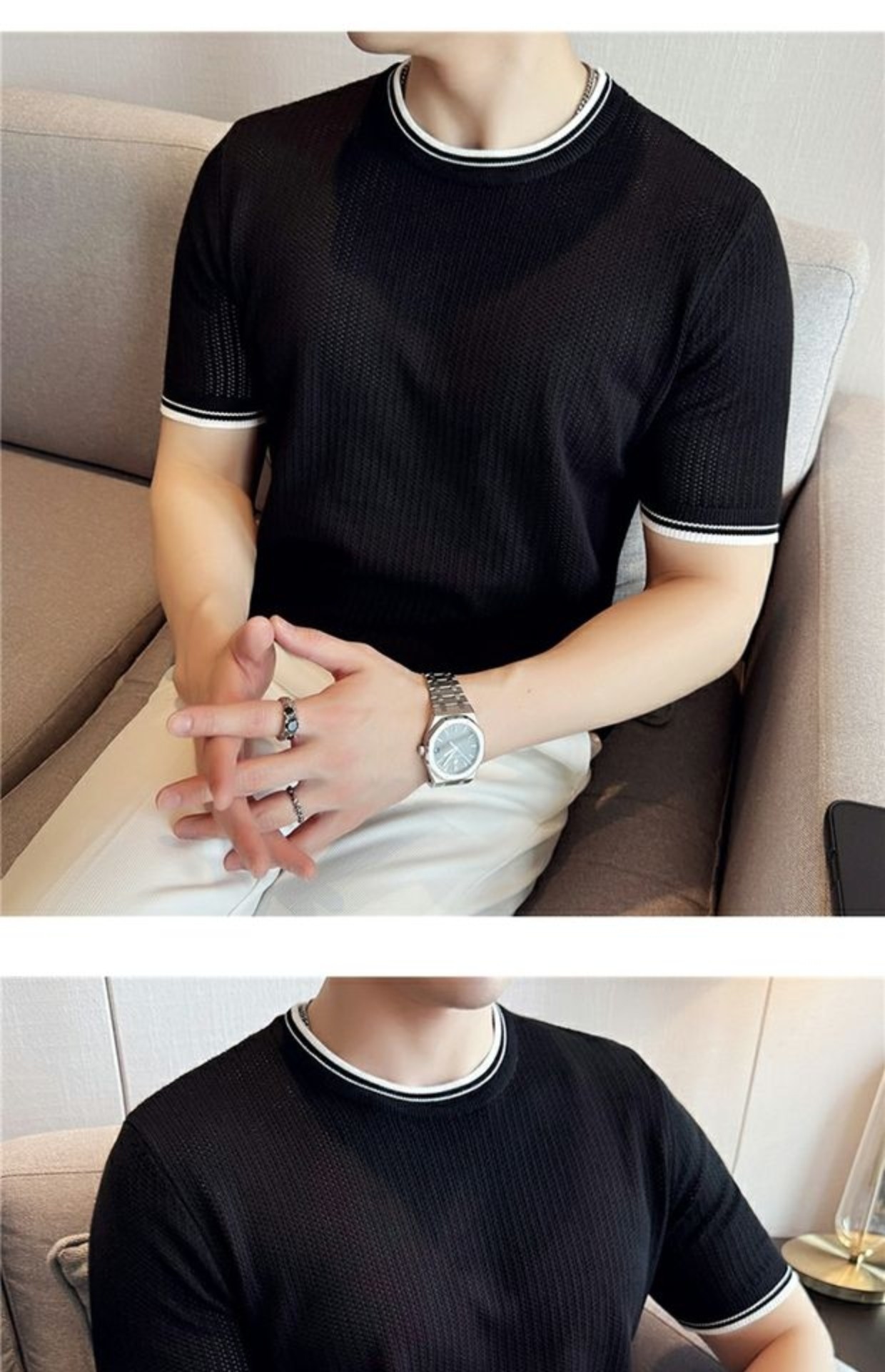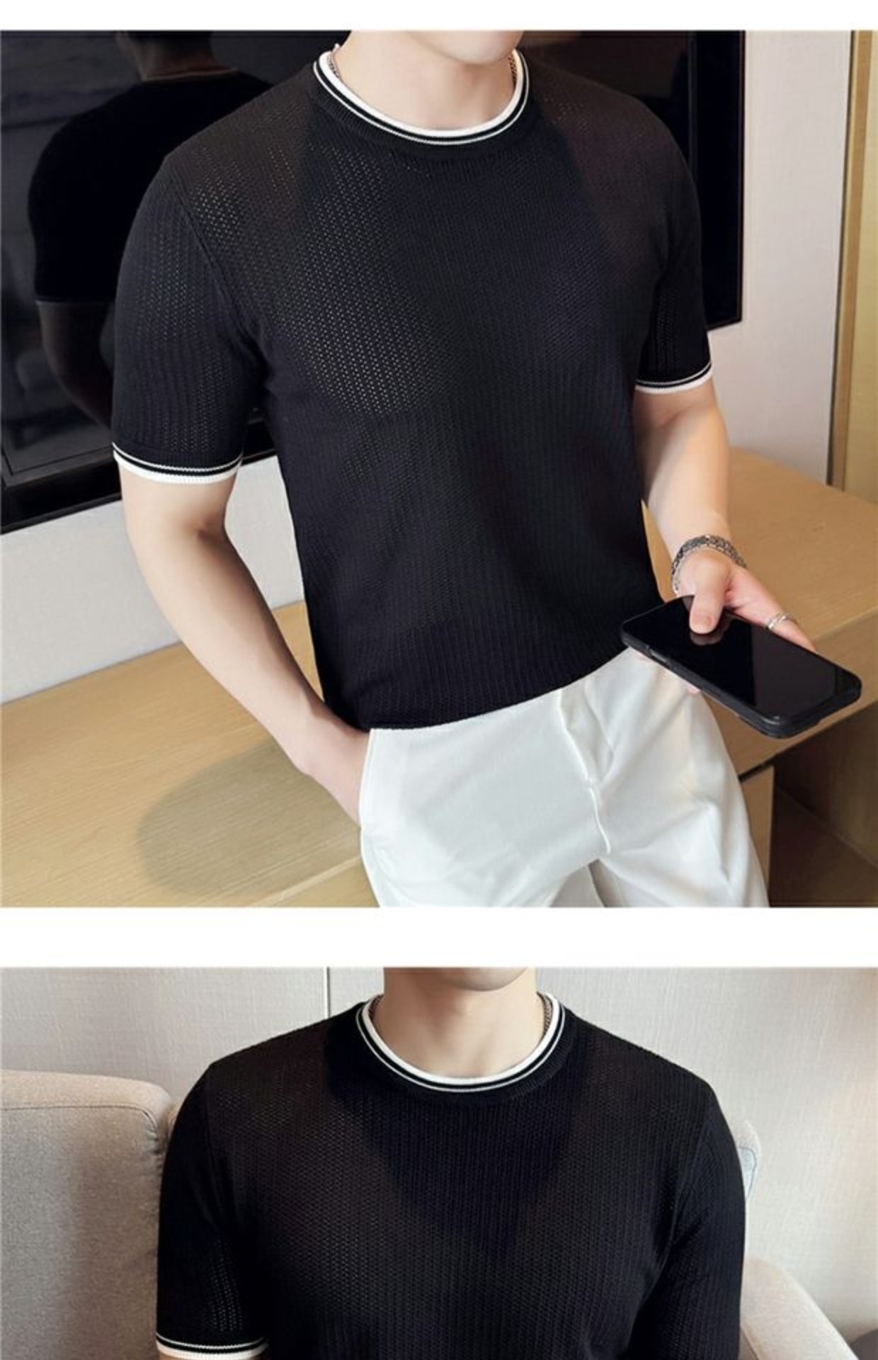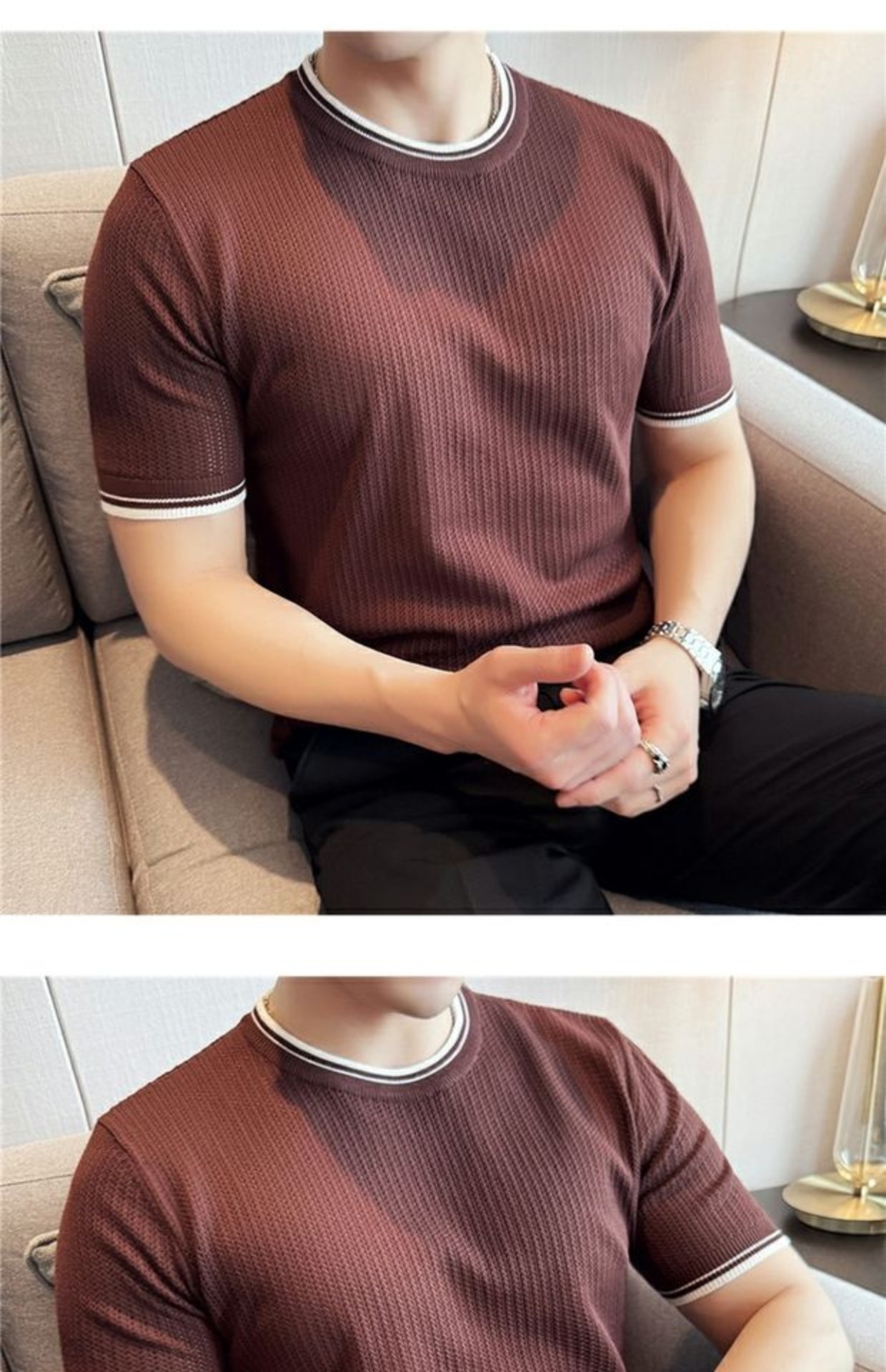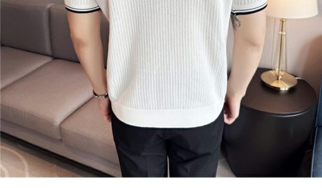 Men's Round Neck Contrast Color Stretch Knitted T-shirt