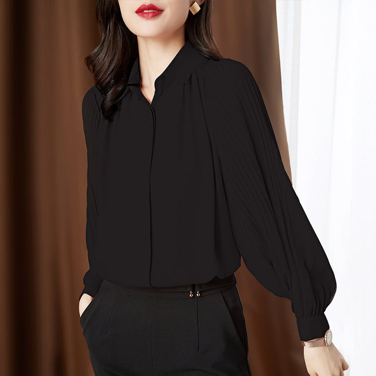 Elegant chiffon cardigan designed in a loose OL commuting style, perfect for both professional and casual wear. Crafted from high-quality polyester fiber, this long-sleeved top features delicate folds, splicing, and three-dimensional decorative elements. The puff sleeves and lapel collar add a refined yet stylish touch, while the single-breasted front completes its polished appearance.